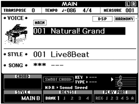 - Lo schermo monocromatico LCD (320×240 punti) consente di controllare la navigazione tra funzioni software, la selezione di suoni, stili e MIDI file ed anche di visualizzare lo spartito (Score) o il testo (Lyrics) dei MIDI file.