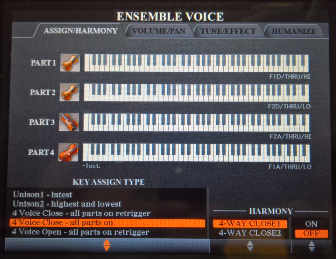 - 4 Voice Close: le quattro parti suonano nell’ordine: la nota più alta va allo strumento assegnato alla parte 1 (Left), scendendo si va alla parte 2 (Right1); poi si passa alle note più basse, la penultima suona la parte 3 (Right2) e la nota più bassa viene assegnata alla parte 4 (Right3). Sono ignorate le eventuali note suonate sulla tastiera in più, quelle comprese fra le prime due e le ultime due.