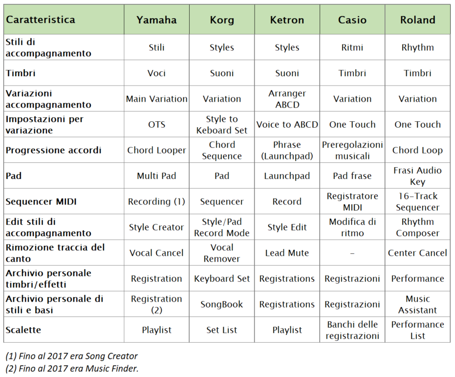Chi sta pensando di cambiare arranger, passando ad un modello di un’azienda diversa, ha un problema: la terminologia in uso fra i diversi produttori di tastiere arranger non corrisponde. La stessa caratteristica può assumere nomi diversi, causando confusione. Ora, dal confronto dei manuali degli arranger, è possibile trarre una tabella sinottica utile per orientarsi nel glossario fra produttori.