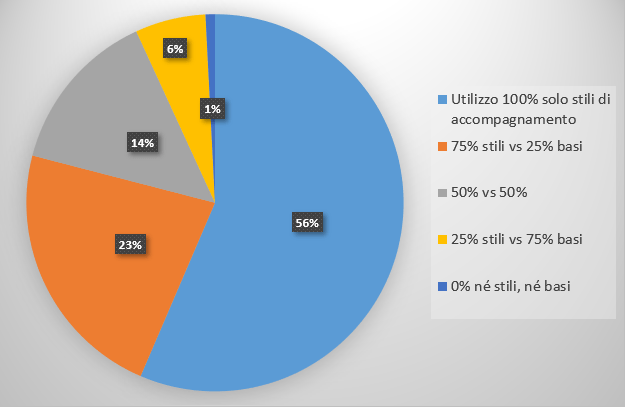 Nell’utilizzo normale del tuo arranger, in quale rapporto percentuale fra stili di accompagnamento e basi (MIDI file/MP3) ti riconosci?