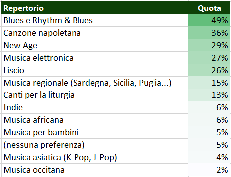 Risultato. Questa domanda ammetteva risposte multiple. La quota di graduatoria rappresenta dunque la percentuale di volte in cui quel repertorio era stato selezionato rispetto il totale dei partecipanti al sondaggio. Onestamente i risultati qui sono in linea con quanto atteso in generale e, soprattuto, per le prime quattro posizioni della classifica. Da osservare come il tasso di realismo garantito dal genere Unplugged sia a ridosso dei primi della classe; mentre le colonne sonore, che avevano fatto la fortuna dei primi arranger negli anni ottanta, siano ora in caduta libera.