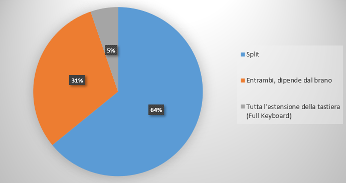 Risultato. Gli arranger sono nati tutti con lo split. Successivamente, i top di gamma hanno dato la possibilità di sfruttare l’intera estensione della tastiera per il riconoscimento degli accordi a favore di chi possiede una valida tecnica pianistica. Non mi sorprende quindi che solo il 5% ne faccia uso.