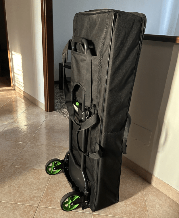 Parliamo del carrello che ho scelto: leggero, resistente, economico. Pensato per l’edilizia o la spesa al mercato, ma perfetto per l’artista stanco. Io devo trasportare una tastiera arranger da 61 tasti e – soprattutto – ho superato da tempo le 60 primavere. Il carrello che ho acquistato regge fino a 70 kg (io non mi fiderei comunque a caricare strumenti con più di 25kg su questa tipologia di carrelli: se qualcuno dei lettori ha fatto questa esperienza, sarei lieto di conoscerla). Il top è che si richiude in un attimo, occupa poco spazio in macchina e mi evita sollevamenti acrobatici da fine serata, quando tutte le articolazioni del mio corpo sono allo stremo. Anche le manovre per entrare e uscire dall’ascensore ora sono molto agevoli. Le ruote girano fluide anche su sanpietrini o backstage disastrati. Evito solo i terreni in ghiaia dove si hanno oggettive difficoltà a scorrere. Apprezzo il manico telescopico soprattutto perché è senza maniglie sporgenti. La pedana ha una superficie antiscivolo che, fidatevi, mi ha salvato più di una volta nei carichi al volo.
