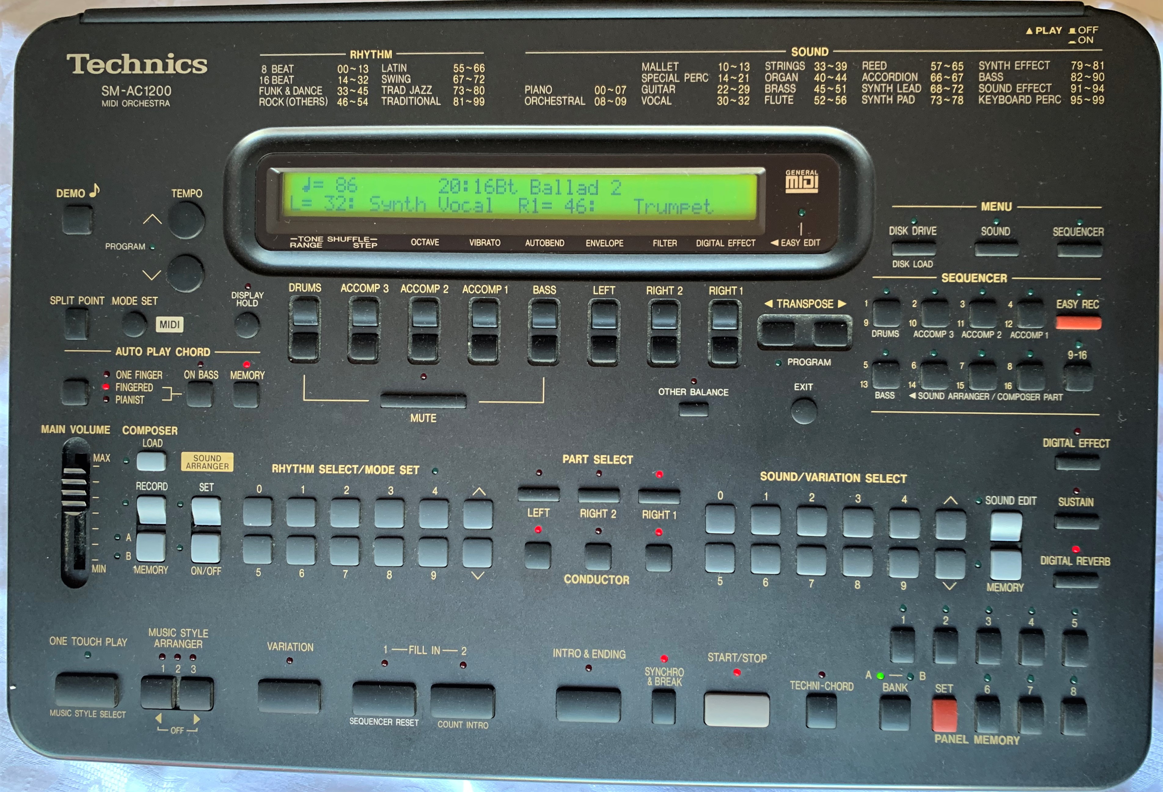 Veniamo al prodotto in esame oggi: SM-AC1200. Made in Japan. Della bellezza di quei suoni, vi abbiamo già detto. Aggiungiamo che nel 1994 cominciavano ad affermarsi i primi strumenti dotati di unità effetti DSP entro lo strumento, permettendo un rapido accesso a riverbero e Chorus. SM-AC1200 ereditava dagli arranger dello stesso produttore un pannello con pulsantiera alquanto affollata: questi strumenti richiedevano un po’ di pratica prima di conoscerli a fondo. Dopo un discreto periodo però, alla fine si poteva fare di tutto e farlo in un attimo. Per comandare la sezione arranger (100 stili di accompagnamento) era apprezzato il tasto One Touch Play che richiamava le voci principali da suonare in tempo reale per ciascun stile; grazie all’accoppiata con la funzione Music Style Arranger, si poteva passare a tre variazioni ulteriori, sia per l’accompagnamento sia per le parti principali.