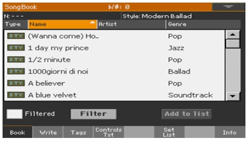 Per facilitare la ricerca e il richiamo di queste impostazioni, ad ogni elemento del SongBook è possibile associare il titolo del brano, il genere, e l’artista. Le impostazioni salvate possono essere lo stile di accompagnamento, il brano (MIDI o MP3), i suoni, gli effetti per voce o chitarra, i testi, la tonalità, le sequenze di accordi, la velocità del tempo, i volumi, i suoni associati alle parti da tastiera (Up1, Up2, Up3, Low), le tracce in Mute, l’impostazione degli effetti, il Master Transpose e altro ancora. Diciamo che ogni parametro necessario per l’esecuzione di un brano nel modo preferito è a disposizione nel SongBook.